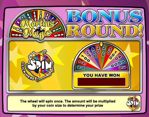 The bonus screen (see below) allows the player to spin a bonus wheel; the wheel is divided into various sections, each of which has a different prize. Players can win between 20 and 1000 coins on this bonus round. The wheel will spin once. The amount will be multiplied by your coin size to determine your prize.